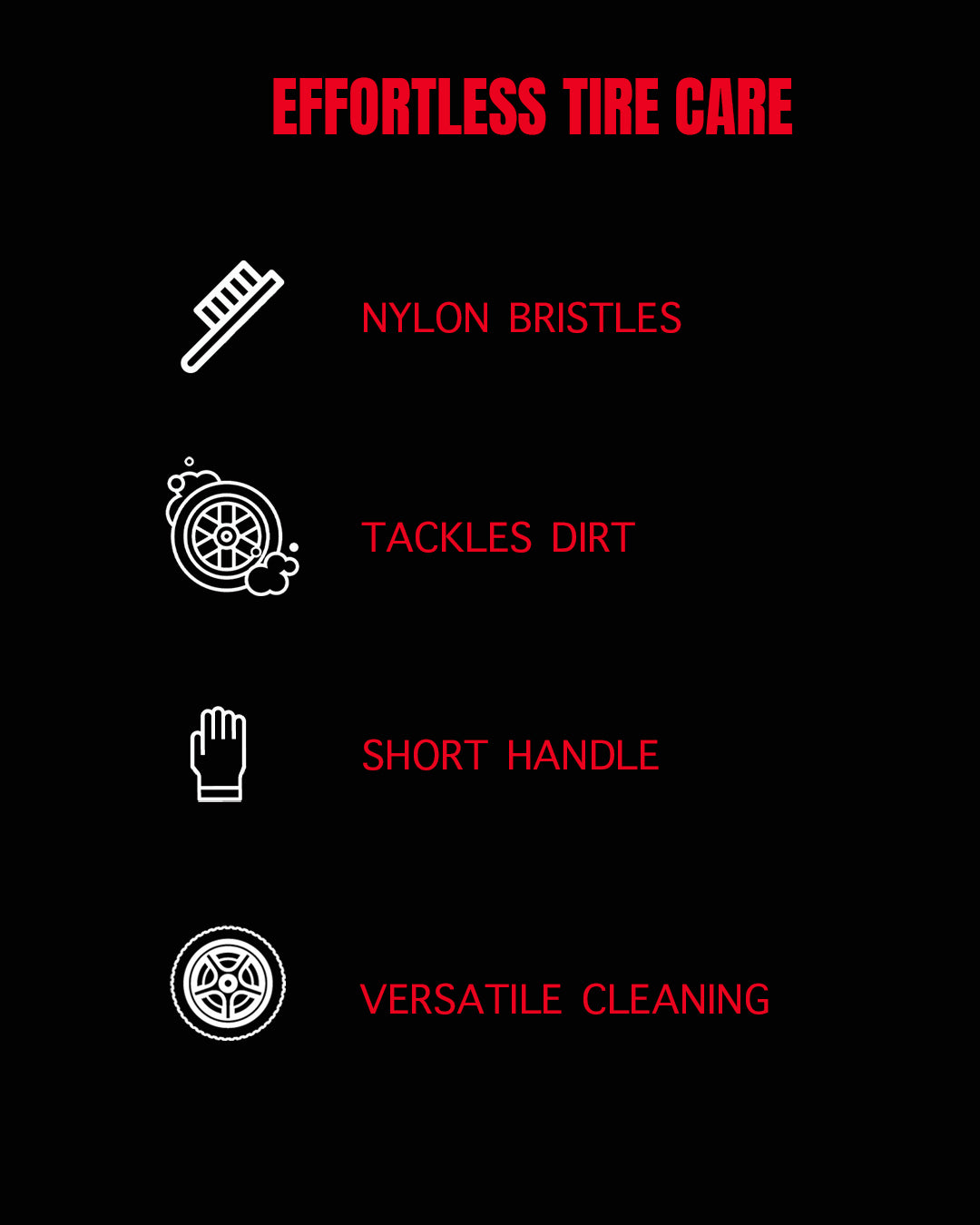 • Durable Nylon Bristles: Designed to effectively remove tough dirt and grime from tire surfaces.